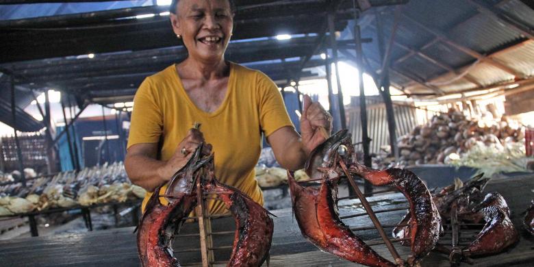 Ikan cakalang yang sedang diasapi diolah menjadi Cakalang Fufu, kuliner khas Manado.